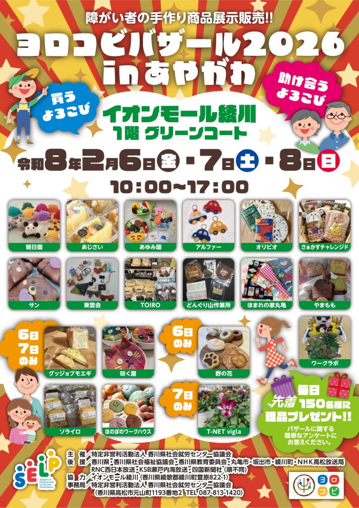 2026年1月8日 / 最終更新日時 : 2026年1月8日 selpadmin123 イベント ヨロコビバザール2026inあやがわ 令和8年2月6日(金),7日(土),8日(日)10:00~17:00 イオンモール綾川(1階グリーンコート)で開催致します。